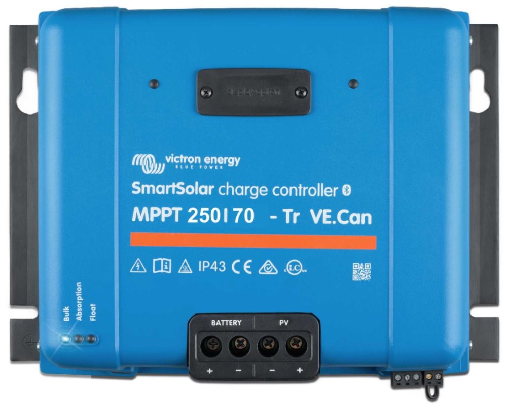Robustní a rychlý MPPT regulátor s VE.Can pro náročné podmínky s napětím panelů až 250 V, nabíjecí proud 70 A. Baterie 12/24/48 V, FV max. 1000/2000/4000 Wp. Vestavěné Bluetooth a konektor pro zásuvný displej.