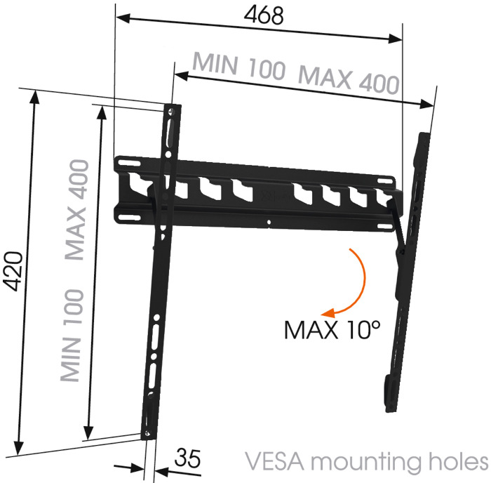 Univerzální držák na LCD Rozvržením montážních otvorů VESA 100x100 až 400x400 Náklon 0 - 10 stupňů Nosnost 80 kg Vyrobeno z masivní oceli Montážní materiál přiložen