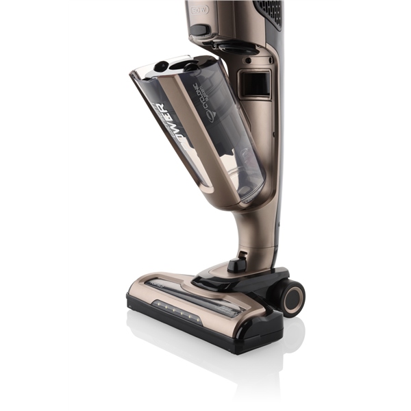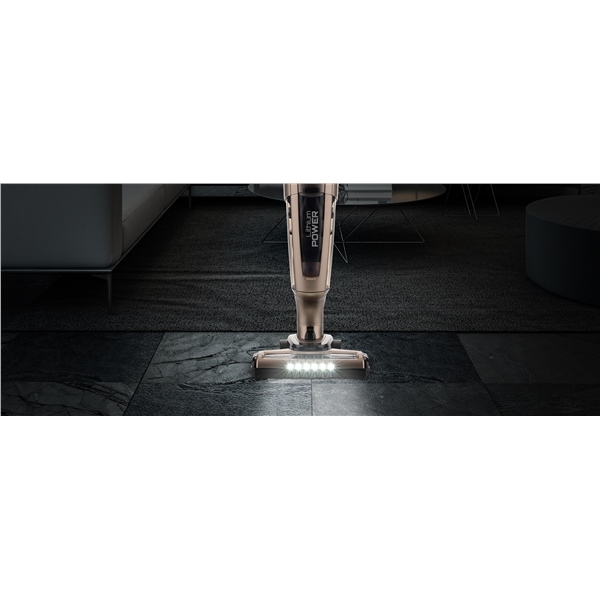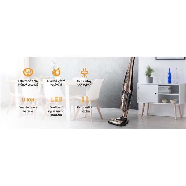 Můžete si zvolit mezi 2 úrovněmi sacího výkonu: Silent mode a maximální výkon. Tento aku vysavač má velmi výkonný motor (150 W) v kategorii akumulátorových vysavačů. Vysavač má účinný cyklonový filtrační systém. Díky velké kapacitě odpadní nádoby o objemu 1 l vysajete více nečistot a nemusíte tak často nádobu vysypávat. Pro lepší viditelnost vysávacích ploch, obzvlášť v rozích a tmavých místech, slouží dostupné světelné LED diody.