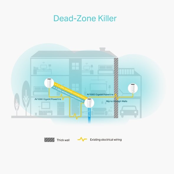 Hybridní systém pro celý dům poskytuje rozšířené pokrytí až do plochy 560 m2 (dvě pásma Wi-Fi a elektrické vedení). Díky powerline technologii maže oblasti se slabým signálem.
