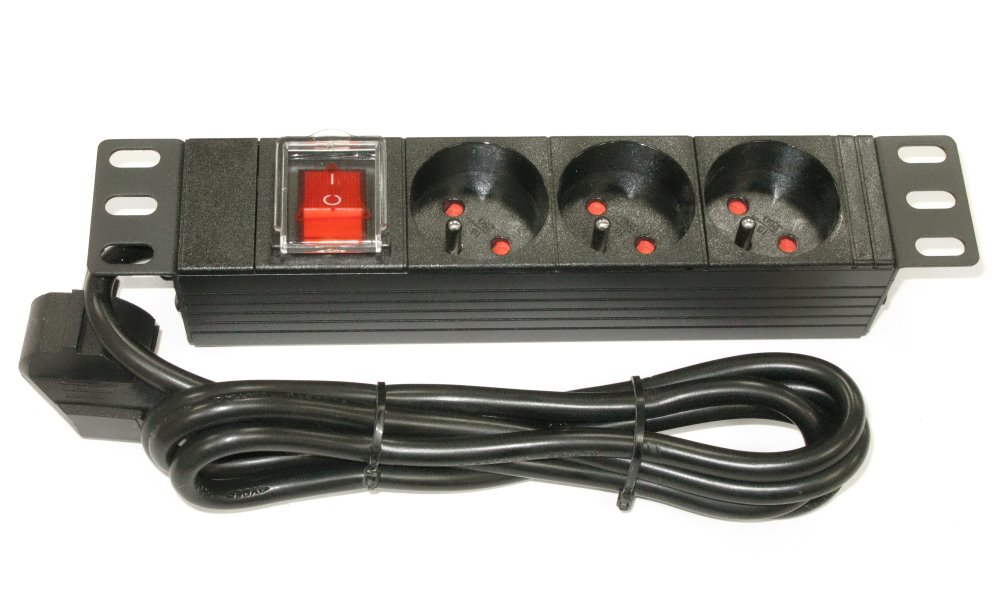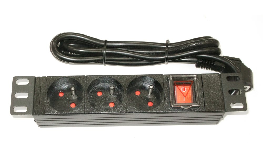 10" rozvodný panel 3 x 230 V, zásuvky dle ČSN, indikátor napětí/vypínač, výška 1U, 1,8 m dlouhý přívod.