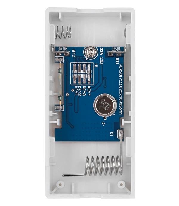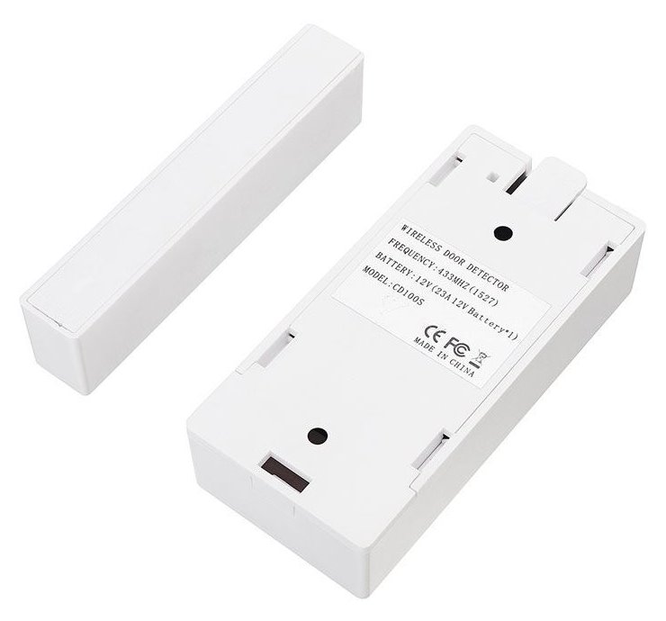 Bezdrátový dveřní/okenní sensor otevření. Přenosová frekvence 433 MHz (dosah 200-300 m). Otevření detekuje odloučením jedné části od druhé.