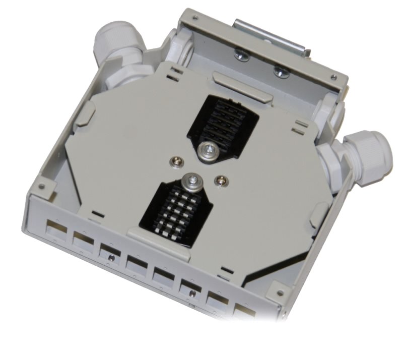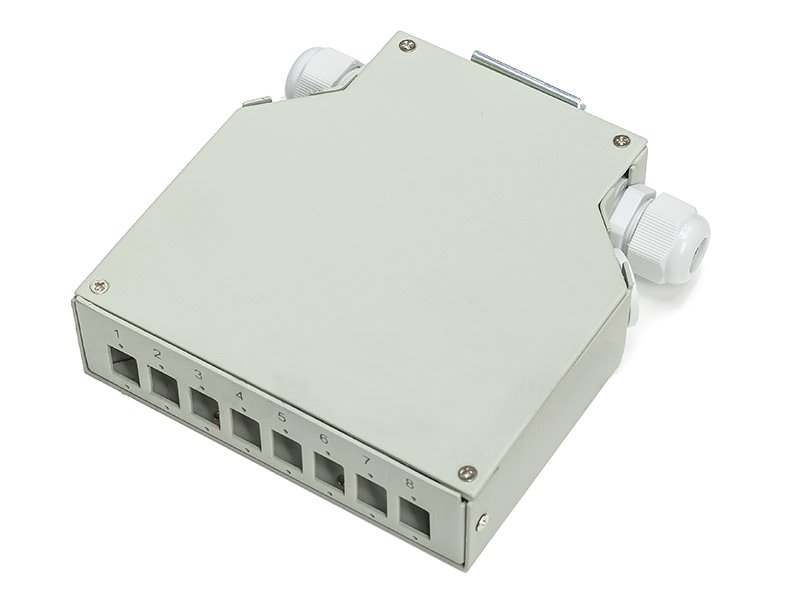 Malý kovový rozvaděč pro upevnění na DIN lištu. Dovoluje instalovat 8 x SC simplex adaptér. Robustní kovové provedení, 4 x vstup (2 x zaslepený + 2 x PG11). Kabel není nutno provlékat, lze i jen založit.