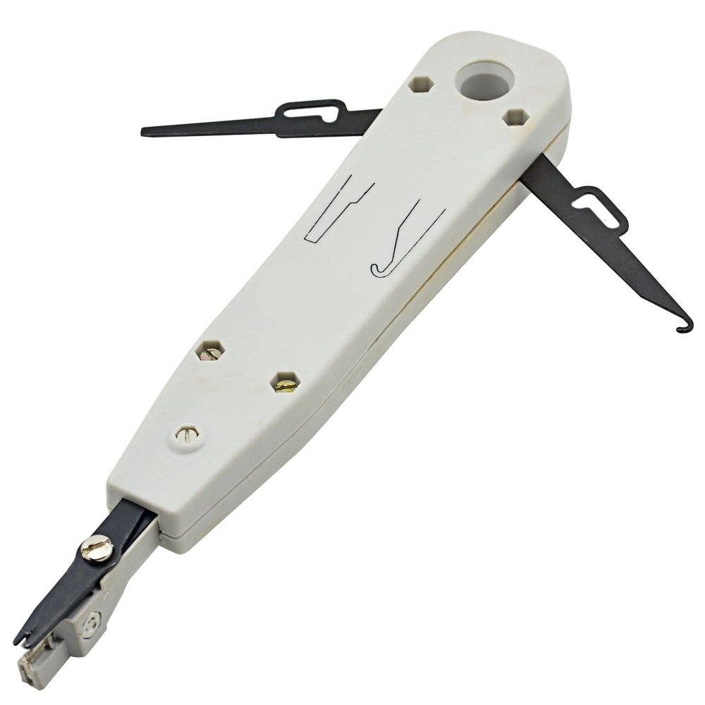 Nastřelovač pro patch panely a zásuvky s vestavěnými nůžkami, háčkem a kleštěmi na vytahování vodičů typu LSA.