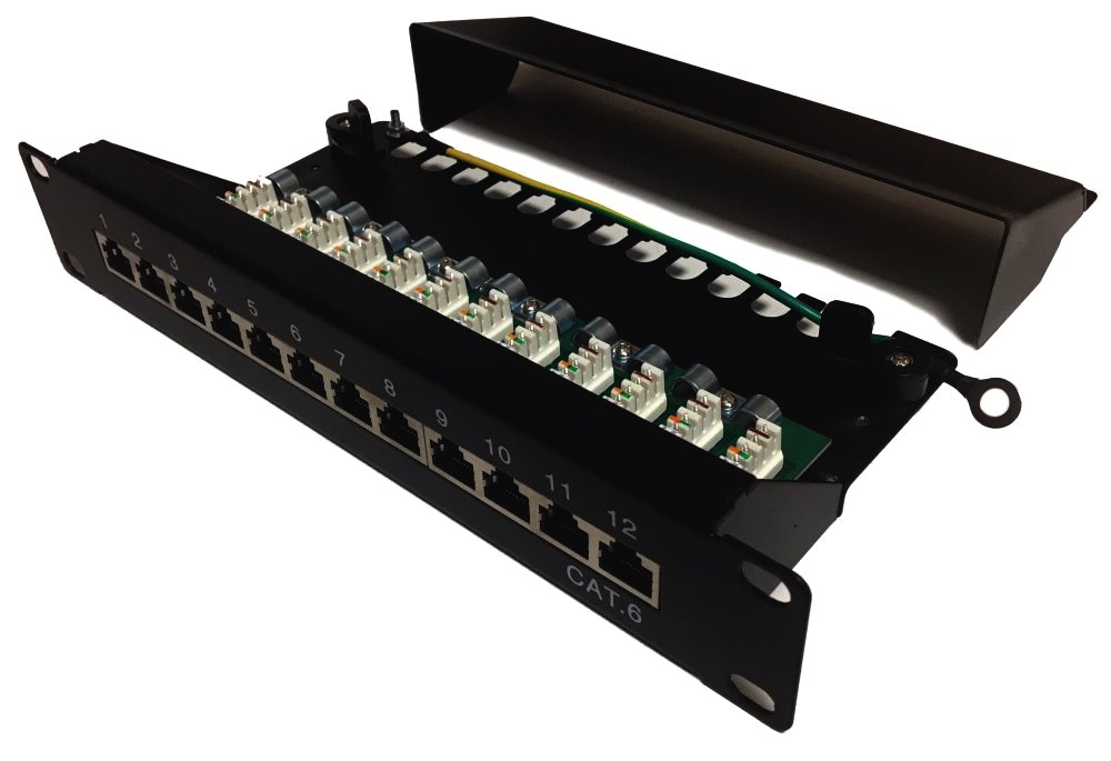 Patch panel osazený 12 porty s Cat.6, vhodný pro narážeč typu LSA. Vnitřní kryt patch panelu dovoluje manipulaci v malé skříni bez rizika vytáhnutí kabelu ze zářezového konektoru. Vyvazovací koncovky dovolují pevně přitáhnout kabelový vývod k panelu. Součástí zařízení je zemnící přívod a napojení stínění přímo na PCB.