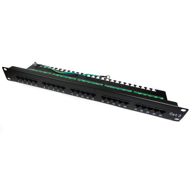 Patch panel telefonní 1U/19", 25 portů cat.3. Rozměry zadní desky činí 430 x 106 mm.