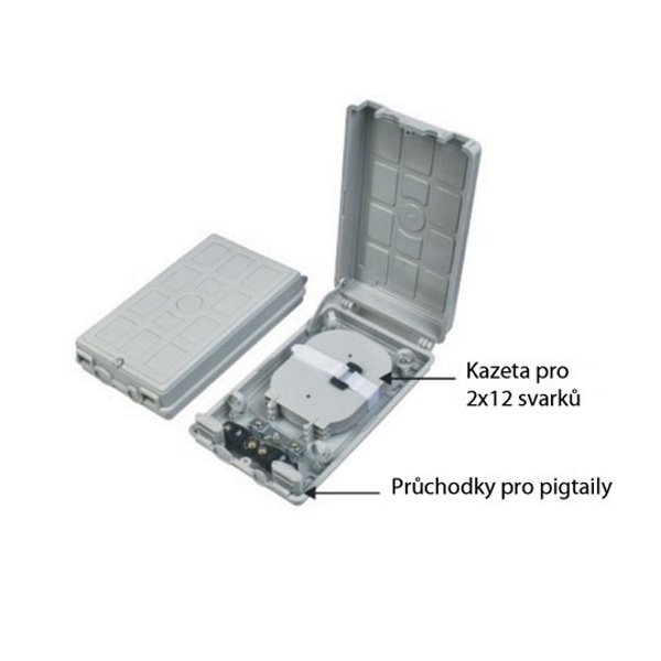 vedení pomocí pigtailů. 24 (2 x 12) svarků, 2 otvory pro průchozí