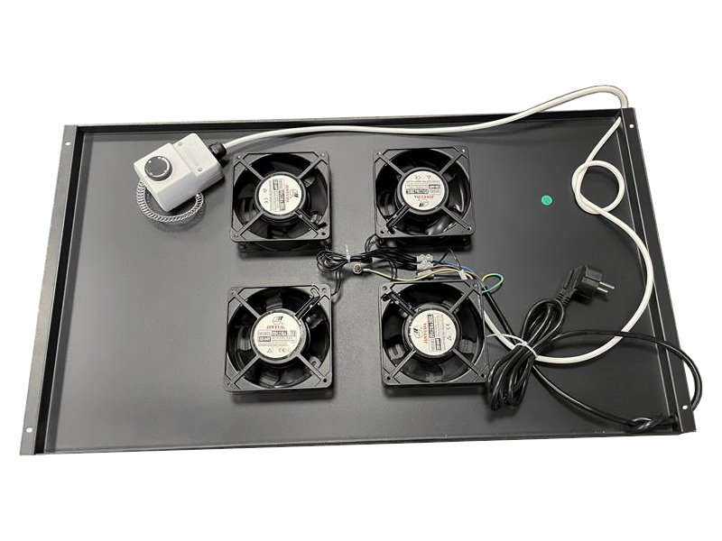 Stropní/podlahová ventilační jednotka do stojanových rozvaděčů, 4× ventilátor o průměru 12 cm, termostatický spínač s nastavitelnou teplotou.