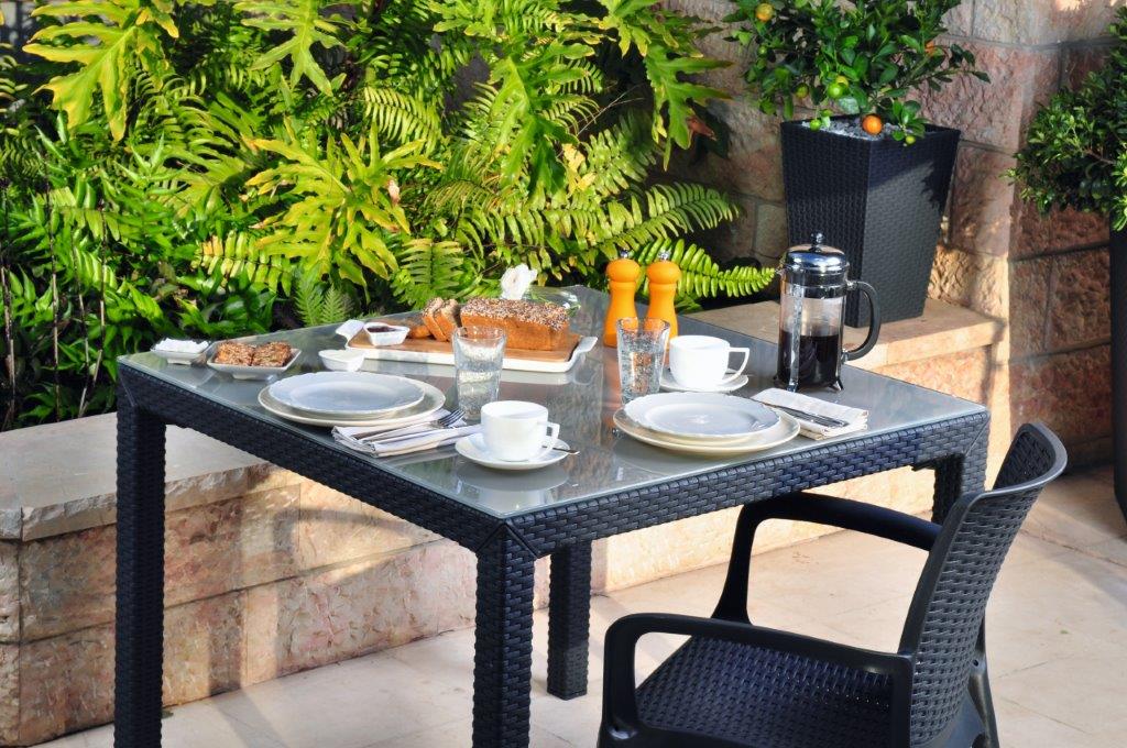 Židle je vyrobená z polypropylenové pryskyřice, která židli propůjčuje extrémní odolnost vůči povětrnostním vlivům, UV záření i proti mechanickému a jinému opotřebení, takže vám bude sloužit spolehlivě a po dlouhou dobu. Vzhledem k ochraně před UV zářením barva židle nevybledne ani na přímém slunečním svitu. Navíc tento materiál přináší také velice líbivý design, kdy povrch křesla imituje pletený vzor přírodního ratanu. Na údržbu vám postačí vlhký hadřík, kdy různé šmouhy a nečistoty na povrchu židle odstraníte pouhým setřením, což minimalizuje starosti s úklidem.
