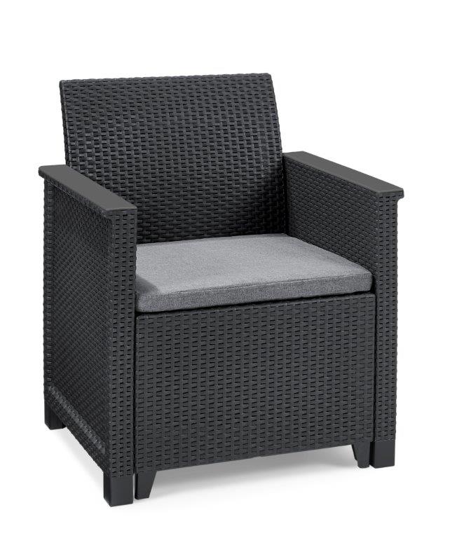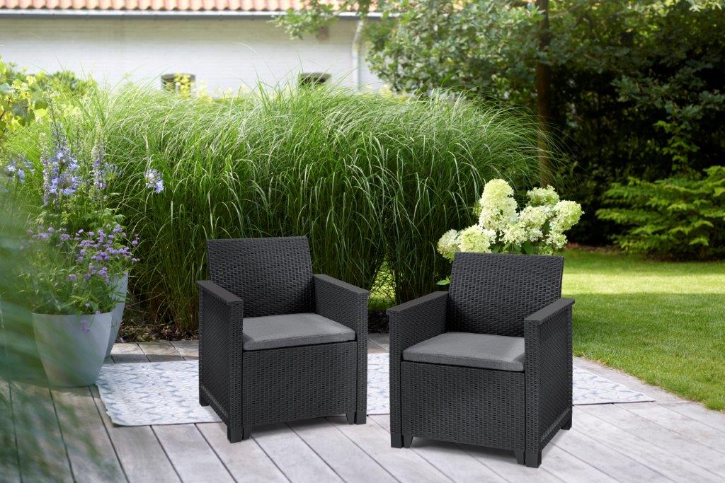 Křesla s ratanovou texturou vkusně doplní téměř každý design zahrady, ale můžete je klidně použít i v interiéru. Materiál křesla je navíc odolný vůči nepříznivému počasí a UV záření, takže krásná grafitová barva jen tak nevybledne.