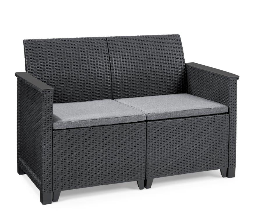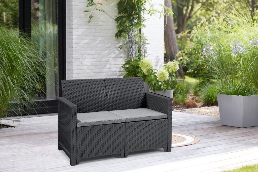 Sedačka s ratanovou texturou vkusně doplní téměř každý design zahrady, ale můžete ji klidně použít i v interiéru. Materiál pohovky je navíc odolný vůči nepříznivému počasí a UV záření, takže krásná grafitová barva jen tak nevybledne.