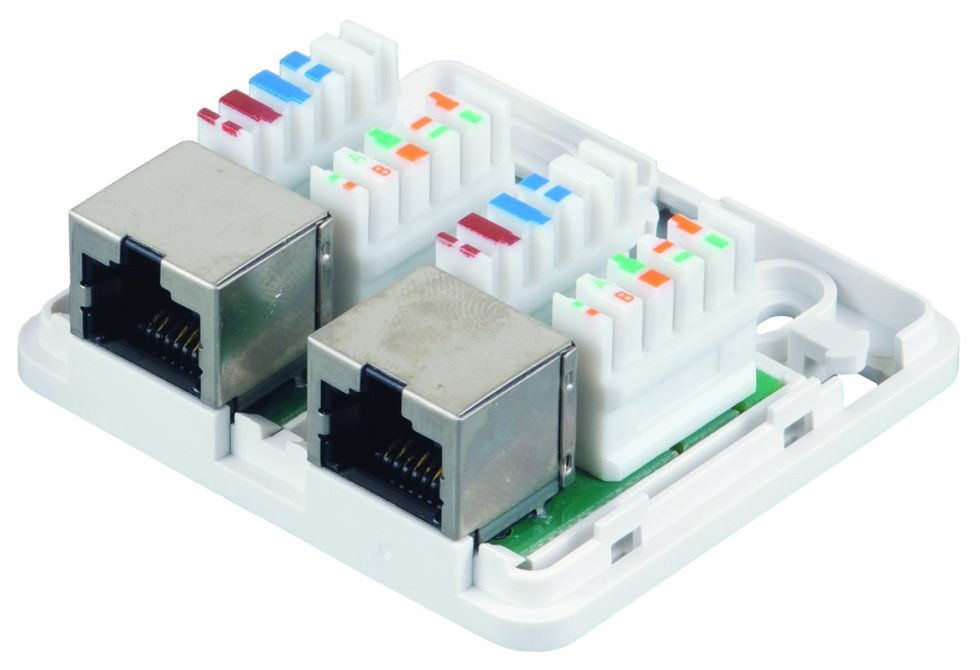 Nestíněná zásuvka je osazena dvěma porty typu RJ-45 a je určena k instalaci na omítku. Datový kabel se zařezává do IDC svorkovnice typu 110, která je označena barevným schématem podle typu zapojení, a to buď podle standardu T568A, nebo T568B. Součástí balení jsou plastové štítky modré a červené barvy, které slouží k označení jednotlivých portů. Nechybí ani oboustranná lepící fólie, která je určena k uchycení zásuvek na hladkém povrchu.