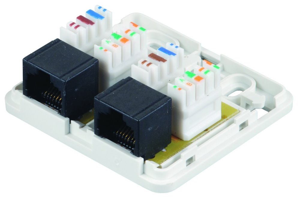 Nestíněná zásuvka je osazena dvěma porty typu RJ-45 a je určena k instalaci na omítku. Datový kabel se zařezává do IDC svorkovnice typu 110, která je označena barevným schématem podle typu zapojení, a to buď podle standardu T568A, nebo T568B. Součástí balení jsou plastové štítky modré a červené barvy, které slouží k označení jednotlivých portů. Nechybí ani oboustranná lepící fólie, která je určena k uchycení zásuvek na hladkém povrchu.