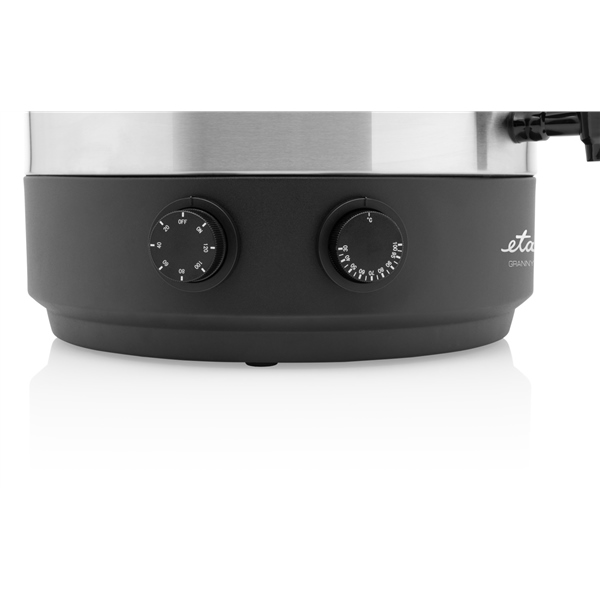 Co si počít s přebytky ovoce a zeleniny, pro které už v žaludku ani v mrazáku nezbylo místo? Praktický zavařovací hrnec ETA Granny přináší snadné řešení. Zavařovací hrnec Granny je vybavený kvalitní nerezovou nádobou o objemu 25 litrů, která pojme až 14 litrových zavařovacích sklenic. Celý proces zavařování vám usnadní odnímatelná nerezová mřížka, plynule nastavitelný termostat (30–100 °C) a nastavitelný časový spínač (na 20–120 minut).