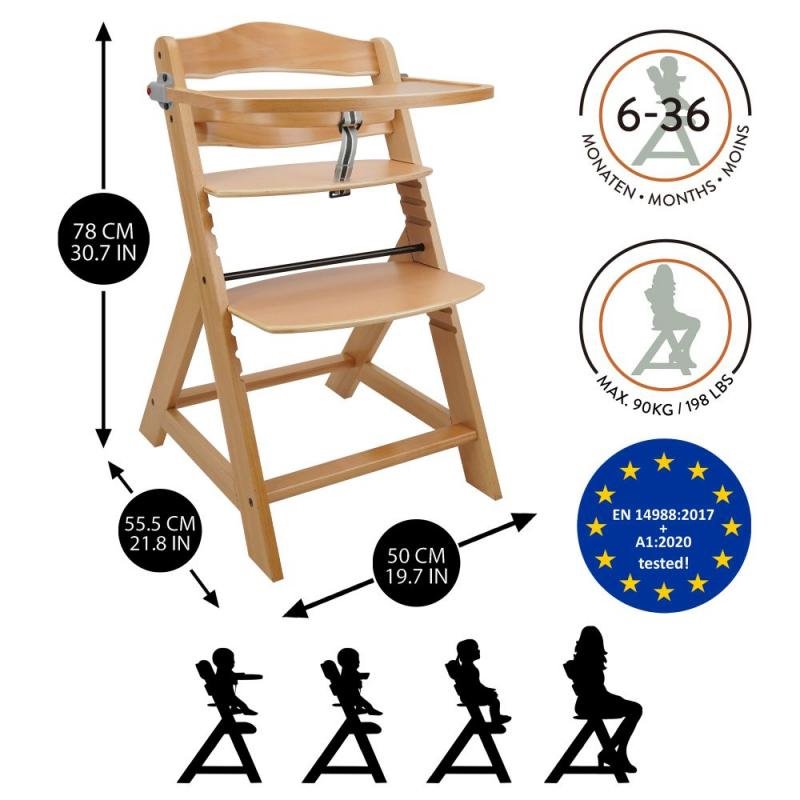 Židle je vyrobená z kvalitního německého bukového dřeva. Využijete ji v jídelně či v kuchyni, ale klidně i v dětském pokoji k psacímu stolu. V případě potřeby změníte výšky sedáku a opěrky nohou. Pokud opěrku nechcete používat, můžete ji demontovat.